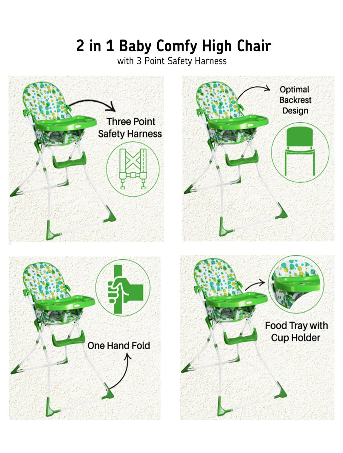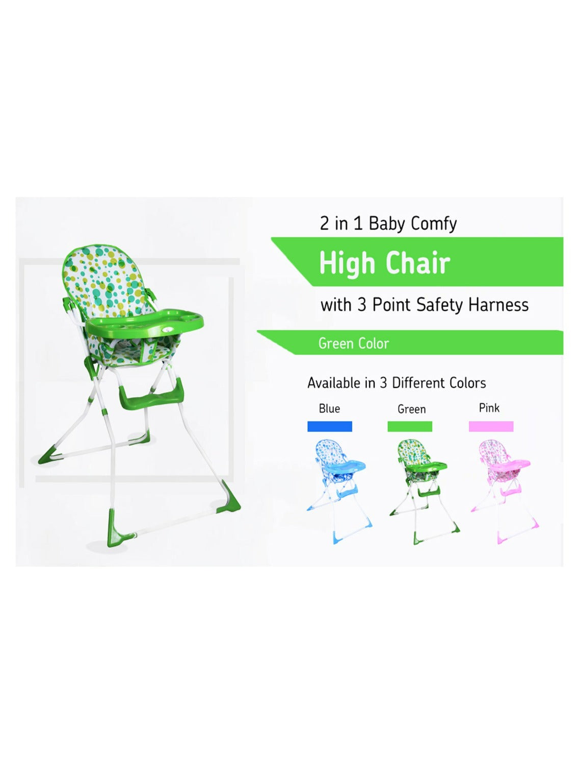 - Three Point Safety Harness : 3 point harness keeps your active baby safely fastened & comfortable at all times.
