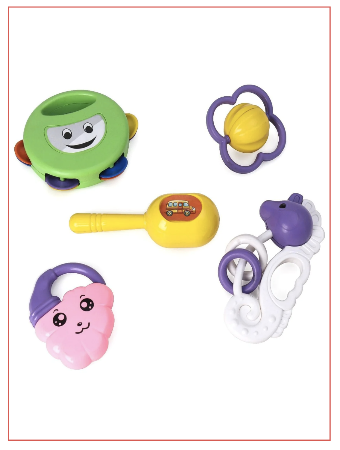 - Colourful set of baby rattles is designed for the amusement of infants.