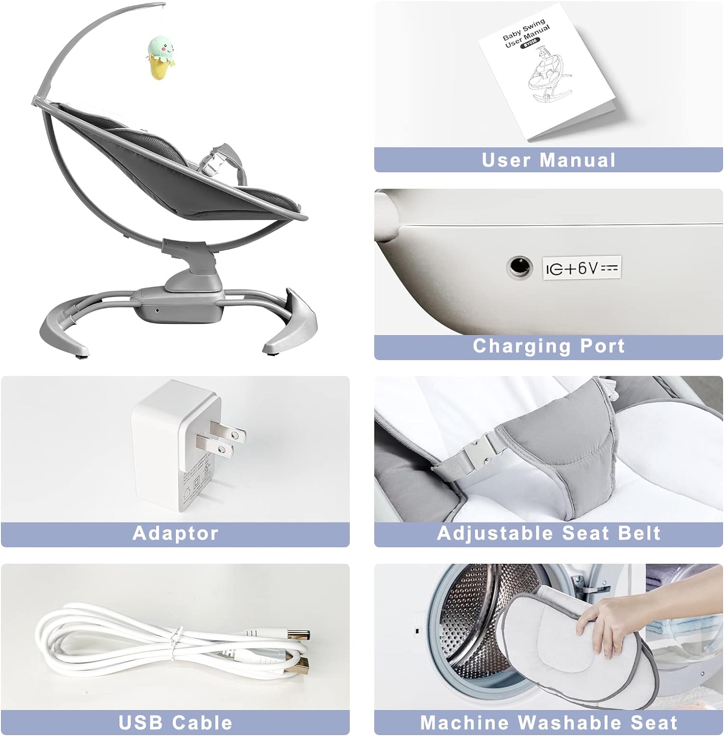 - Breathable Soft Seat and Durable Steel Base: This cradle is made of high-quality steel material, which is strong and durable. Durable steel base provides the swing with stronger load-bearing stability, firm and anti-slip. Double-sided lying pad selection, soft cotton pad or breathable mesh pad, Provide a comfortable environment for newborns.USB cable and power block are provided, swings can also be powered by four x 2 C batteries (without batteries)