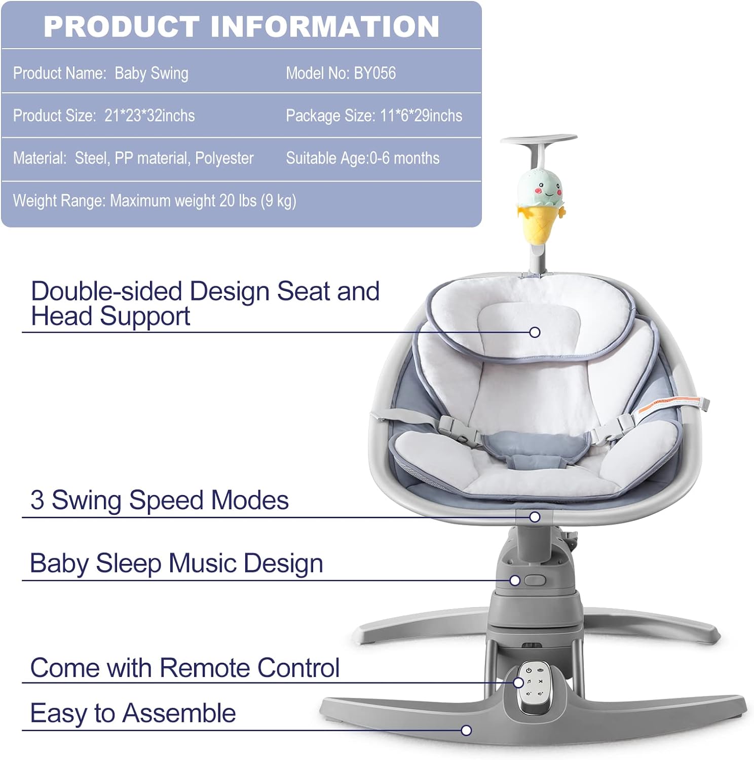 - 8 Preset Lullaby and Remote Control: dual-mode control, which can remotely control the baby swing through the button or remote control, easily switch the lullaby, adjust the music volume, and control the swing speed of the baby swings. SYCYH electric baby swing is equipped with an automatic timer. After pressing the start button, the indoor baby swing will automatically stop working after 30 minutes. Suitable for infants between 7.7 lbs to 20 lbs (3.5 kg to 9 kg), 0-6 months old