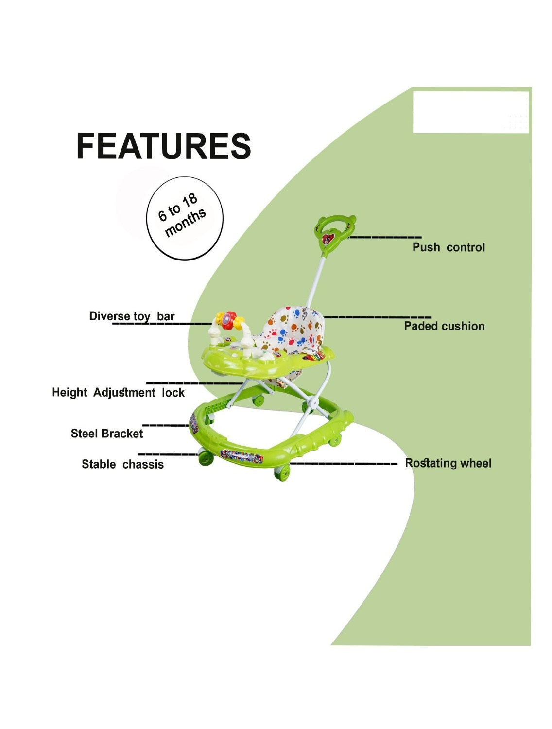 - Detachable Push Handle which allow parent to push the walker if child is sitting on the seat