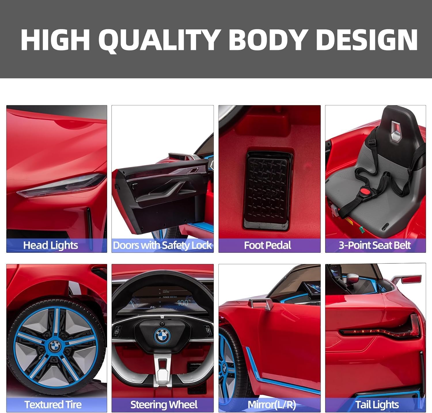 - 🥰💝【Luxury Enjoyment】: This realistic BMW i4 children's car offers a premium driving experience with its bright LED headlights and luxurious seats, making it perfect for your little boys and girls. It also features an MP3 control panel with a power indicator light, allowing you to play your child's favorite music through FM radio, Bluetooth, or USB. This electric children's car is an ideal gift for birthdays, parties, Christmas, New Year, and more.