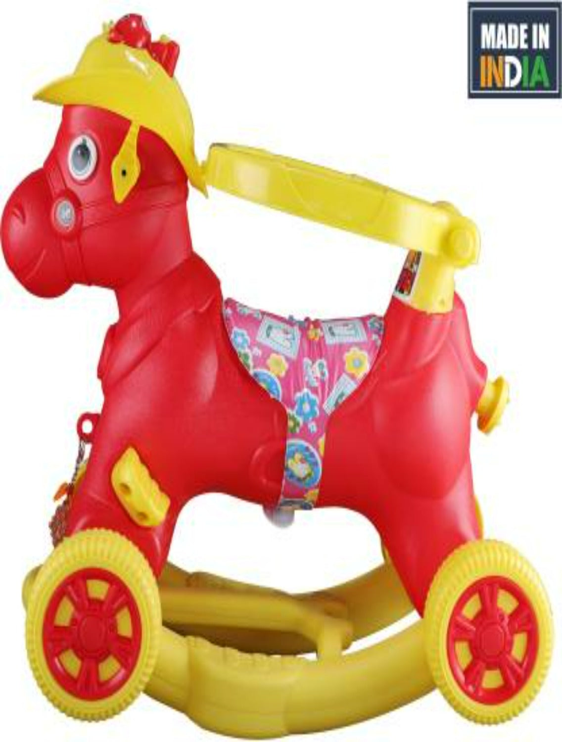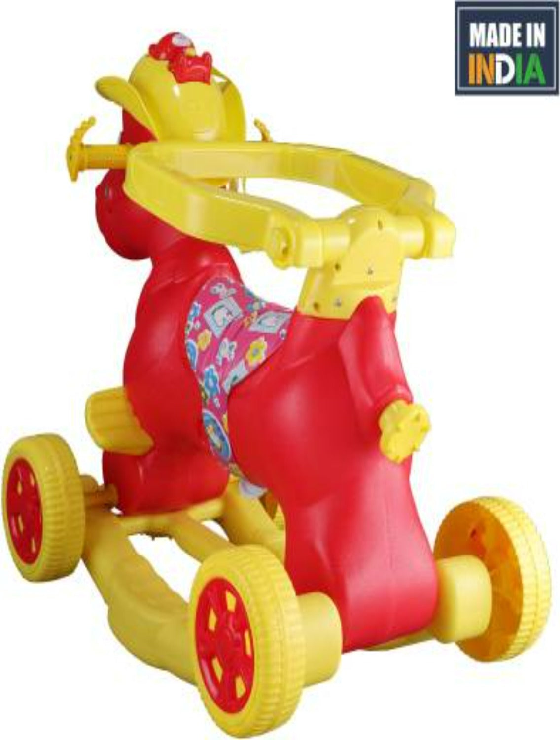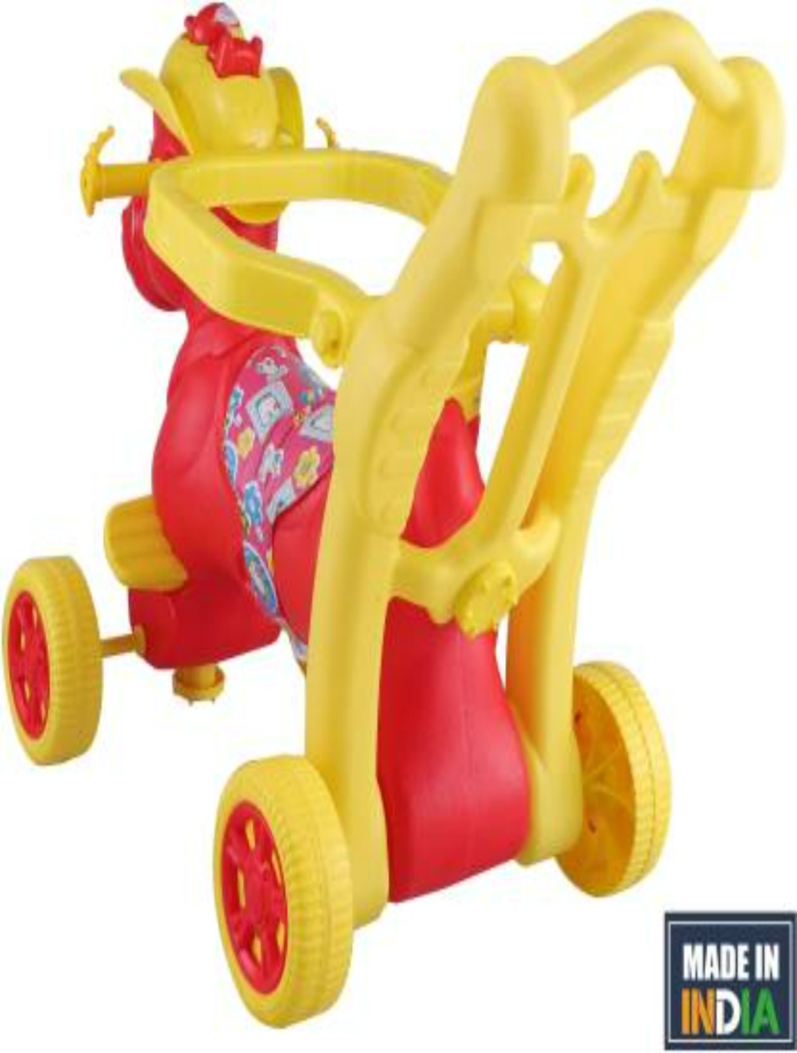 Derby Horse 4 in 1 Ride on for your love ones. 100% assembled just open and use. No headache to assemble then use. Quality features makes it prominent product for your kid. Which are as follows. 1. High quality plastic. 2. Four in One use ( a. Ride-On, b. Rocker, c. Walker, c. Push back ride-on) 3. Keeping safety in mind Anti-Falling Lock system used. 4. For entertainment purpose Poem music feature added.