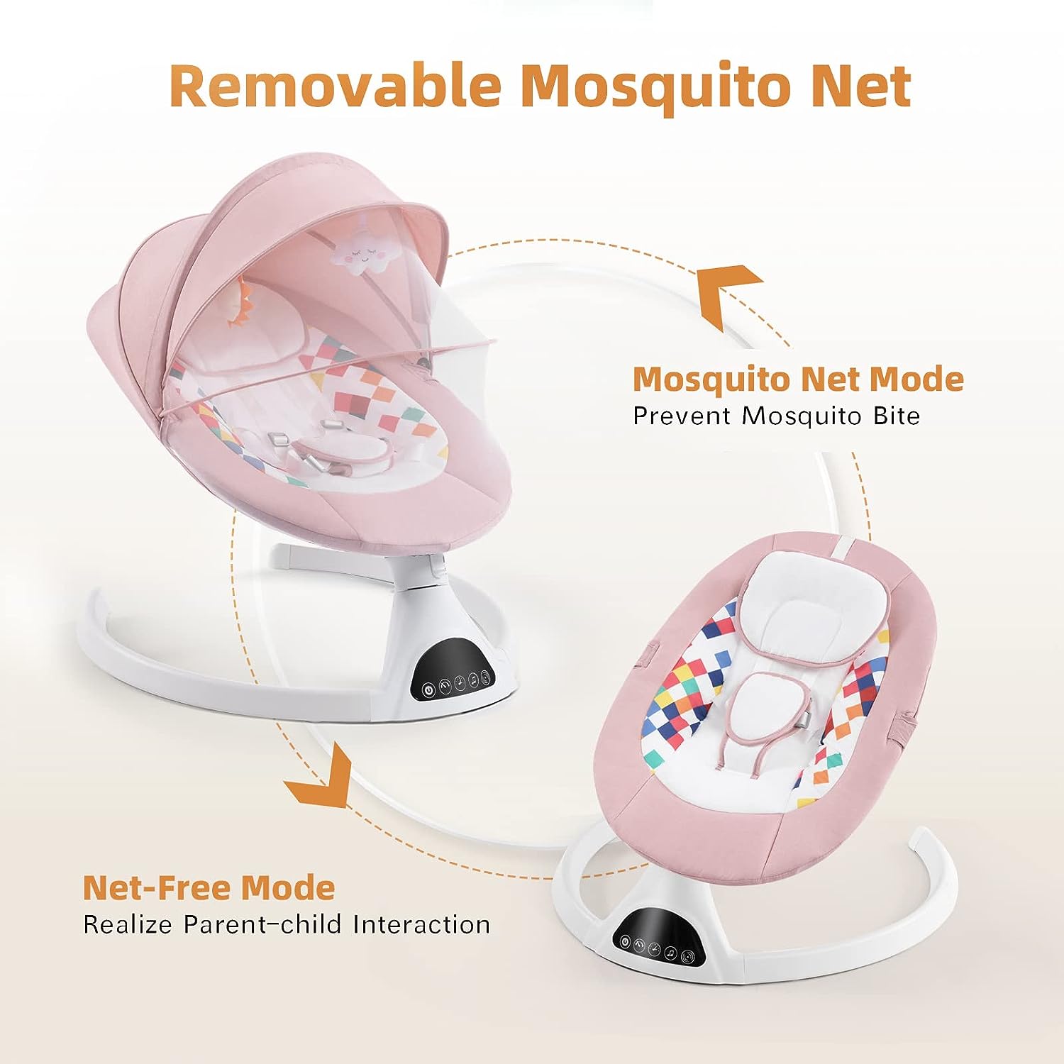 - Portable Baby Swing: Jaoul baby swing is lightweight which makes it good for you to move it around. You can keep an eye on and care for your baby anywhere, from the bathroom while showering, to the kitchen while cooking, to your workout room. Easy to assemble and disassemble, travel size, mosquito net, and USB usable make it possible to go out for a trip with your lovely baby.