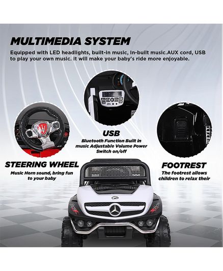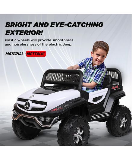 Battery operated ride on electric jeep for kids. This jeep can be operated manually and also with remote. Jeep comes with music system compatible with aux, pen drive and sd card. In their early years kid can sit in the jeep car and parents can control it through Bluetooth remote as kids grow they can ride it manually using foot accelerator. This jeep is operated with 2 batteries and 2 motors. Ride on jeep will run at a speed of 4-5km/hr. Kid will ride it on any flat surface. This jeep is made up of non toxic plastic and very safe for kids to drive.