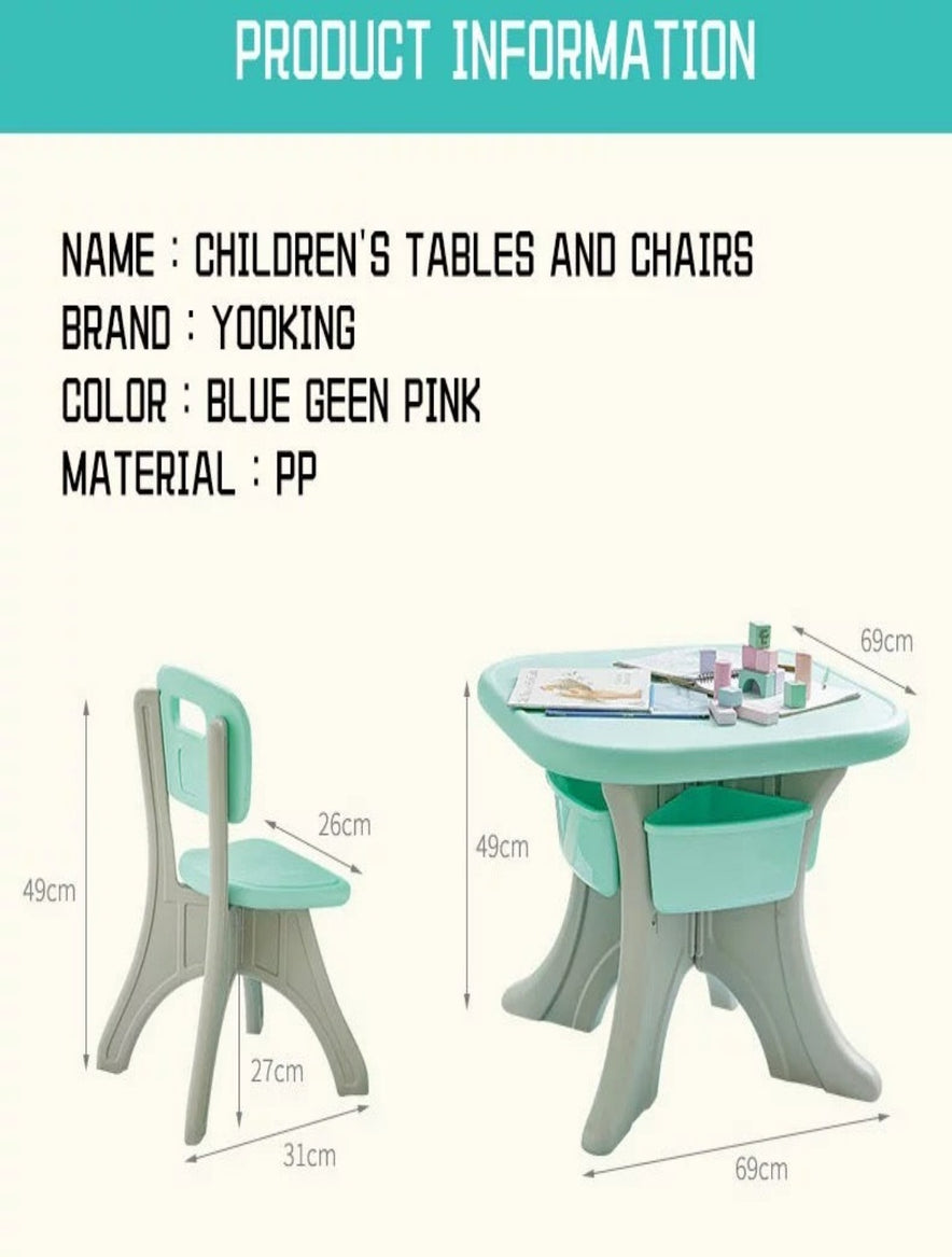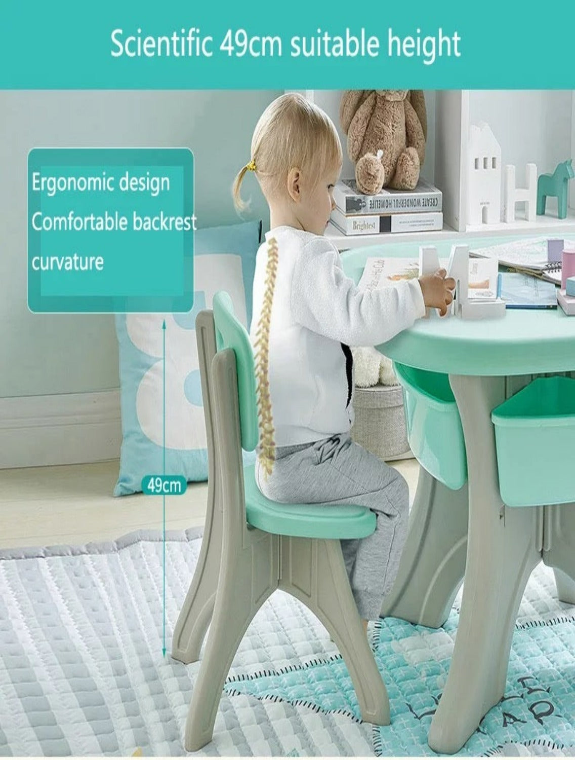 This kids furniture set comes with 1 table and 2 chairs. It's kids sized for kids ages 2 to 6. On top of the table, it suits for playing puzzles, doing arts and crafts, placing snacks, enjoying tea parties etc.